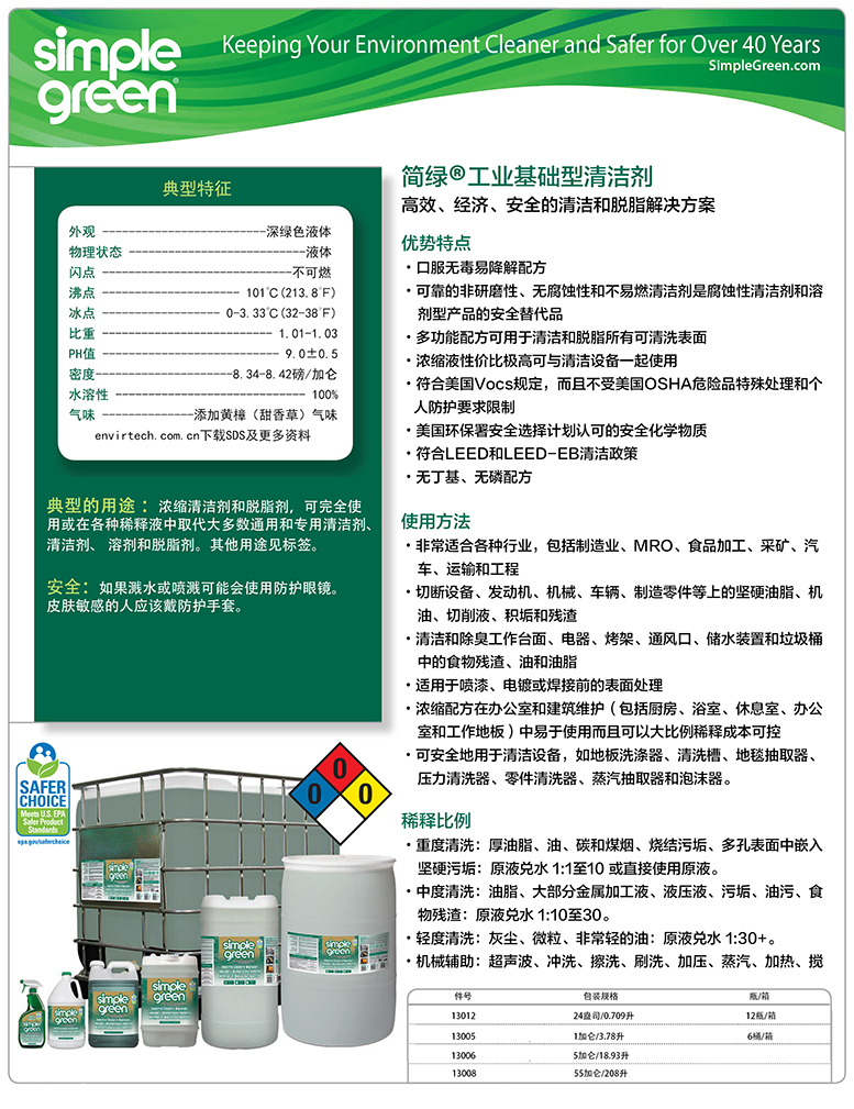 一种功能强大的多用途清洁剂和脱脂剂,可提供比其他清洁剂、漂白剂和溶剂更安全的替代品。值得信赖的配方无磨损、无腐蚀性,并获得美国环保署更安全选择计划的认可对人和环境更安全。Simple Green 设计用于可水洗表面,可用于去除台面、水槽、瓷砖、地毯、地板、室内装潢等上的重污垢、油脂、食物残渣和污渍。这种具有成本效益的浓缩液可以手动使用,也可以在清洁设备中使用,例如地板洗涤器、浸渍槽、地毯抽吸机、高压清洗机、零件清洗机、蒸汽抽吸机和泡沫机。它可以轻松去除设备、发动机、机械、车辆和制造零件上的顽固油脂、油、切削液、积聚的污垢和残留物,使其成为各种行业的理想选择,包括清洁、制造、MRO、食品加工、采矿、汽车、交通和工程。